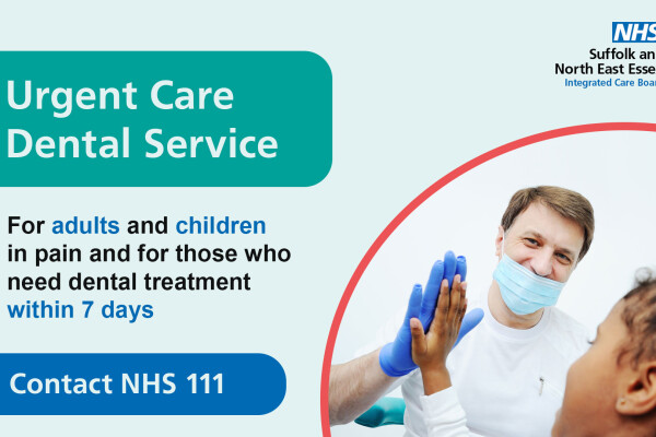 If you have dental pain or need urgent treatment, contact NHS 111 (online or by phone). Urgent appointments are available seven days a week across Suffolk and North East Essex for both adults and children.